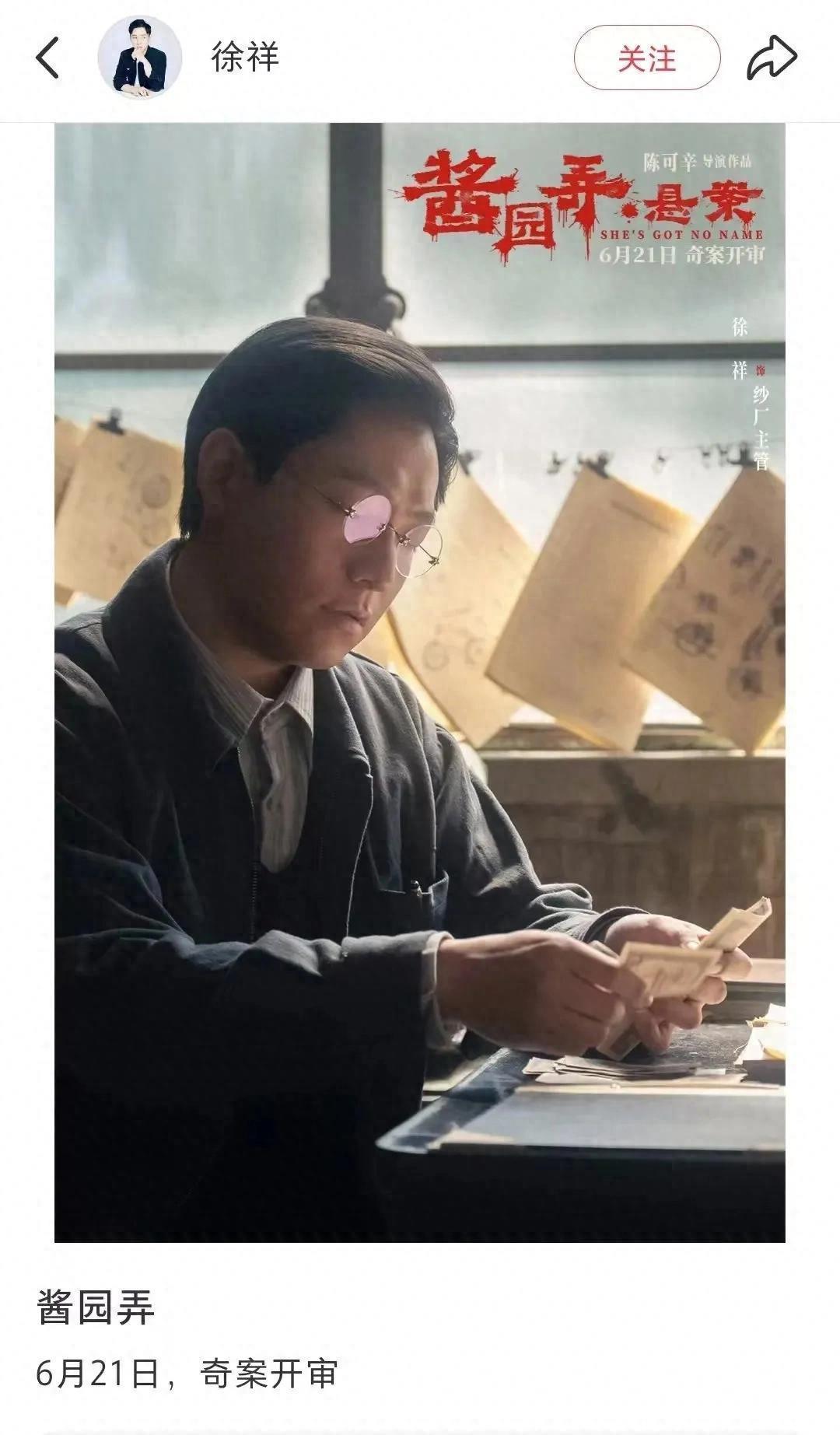 在本年6月行将上映的《酱园弄》里,徐祥饰演纱厂运用;今秋行将演出的沪语电影《菜肉馄饨》里,他还出演了周野芒所饰的男主角的男儿。