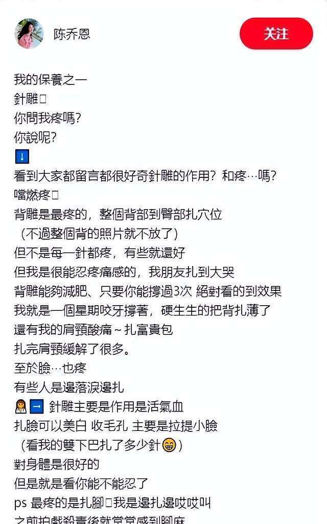 文娱圈里作念“针雕”的明星也不少,但能像陈乔恩这样大方晒出来的,还真未几。这也讲明她心态好,不把网友当外东谈主。话说回想,“针雕”这玩意儿,也不是谁皆能汲取的。要在身上扎几百针,这可不是一般东谈主能隐忍的。是以啊,民众还是要感性看待明星爱护,遴选允洽我方的方式。